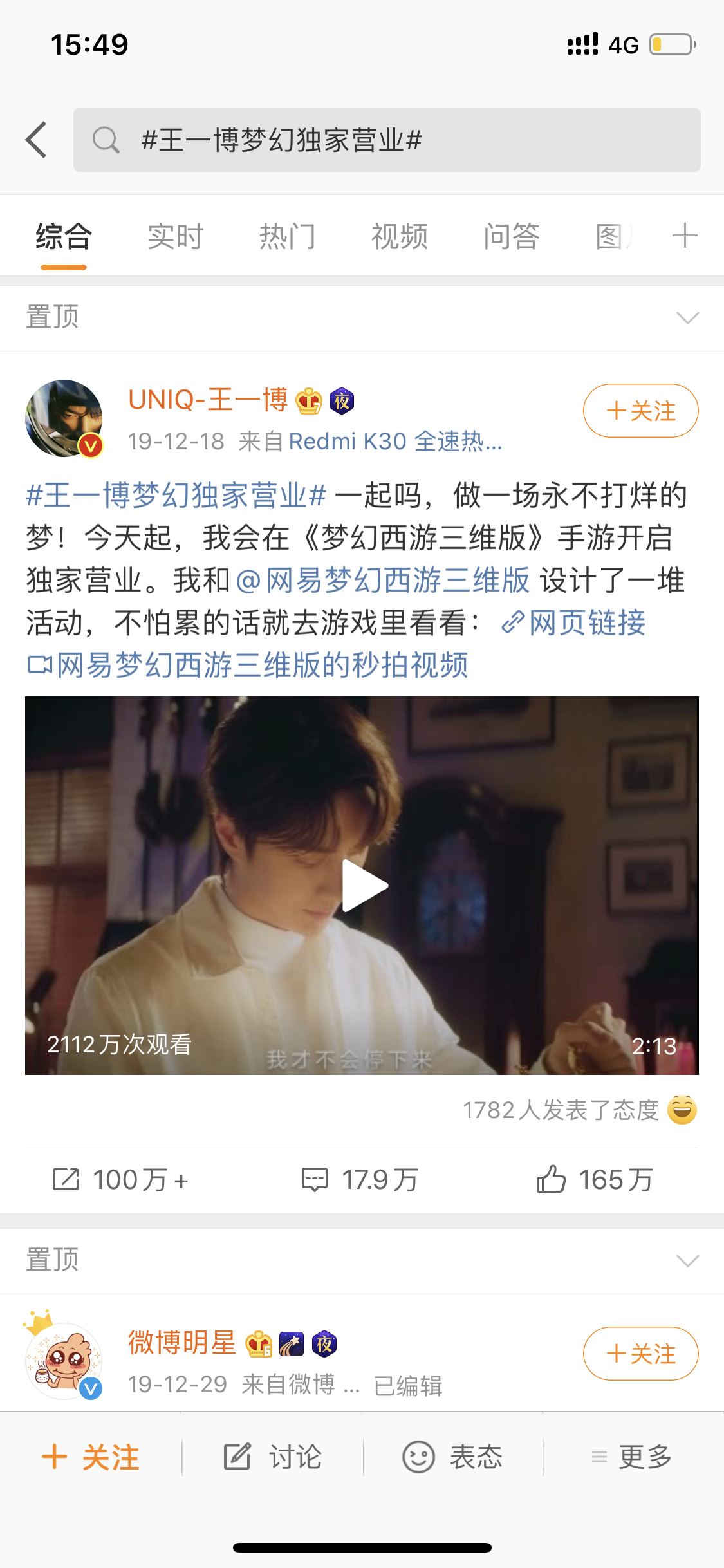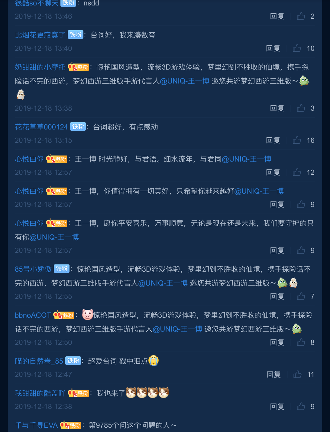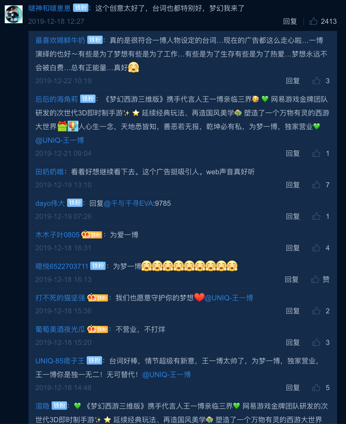 而上线过后,效果也是不俗,我们收获了20亿阅读,800万讨论,再次被王一博的影响力折服,而粉丝们除了为一搏应援,也加入到了游戏,甚至也对广告做出了走心的评价。