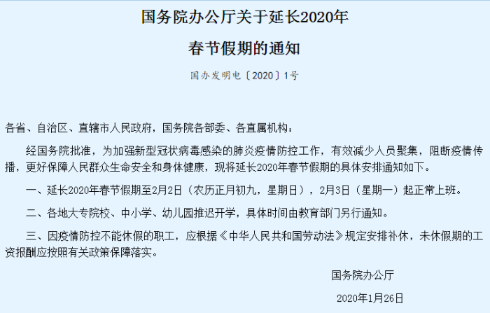 国务院办公厅27日发布关于延长2020年春节假期的通知。经国务院批准,为加强新型冠状病毒感染的肺炎疫情防控工作,有效减少人员聚集,阻断疫情传播,更好保障人民群众生命和身体健康,现将延长2020 年春节假期的具体安排通知如下: