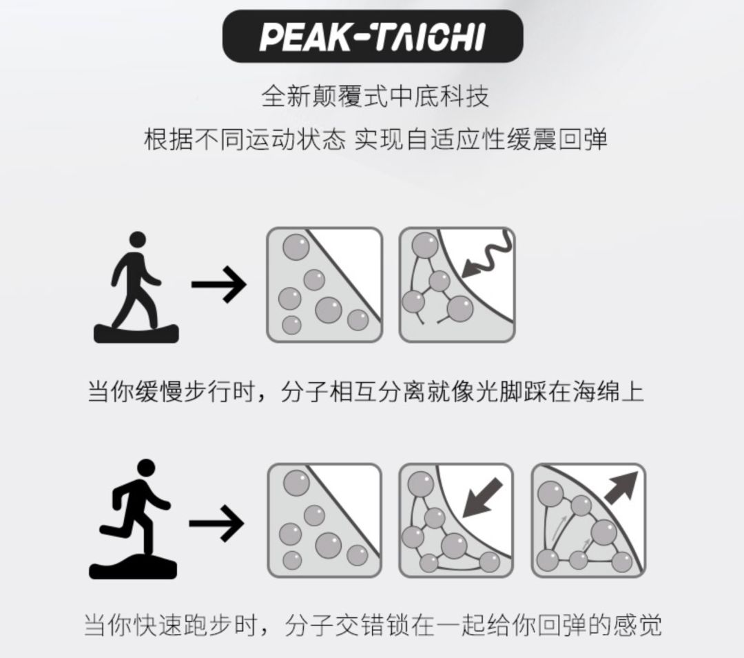 品牌要基业长青,毫无疑问,最基础是产品有核心竞争力。态极科技之于匹克,犹如boost科技之于阿迪达斯,AIR科技之于耐克。态极科技,是一种“遇软则软,遇强则弹”的神奇新材料。用鞋友们的话说,“像踩在云上、棉花上”。