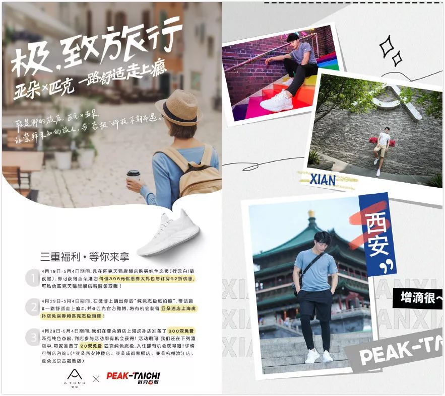 随后的五一假日,匹克态极跨界亚朵酒店,“逛街神鞋”继续深入旅行场景。必须承认,和酒店IP做场景营销,这样的跨界放到整个营销圈,没有那么了不起,可对于老牌的匹克来说,却是它更快而有效的落地到旅行、酒店人群的很好方式,它的场景感,能有效平衡品牌和带货,整个过程,B站、小红书、抖音等相关博主测评传播,带货传播双丰收。