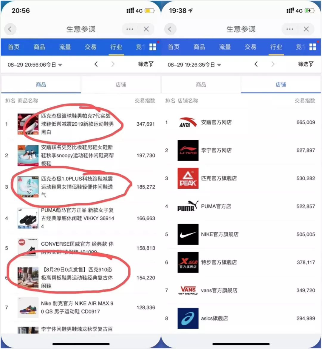 匹克店铺天猫618首日销量暴增2000%,比去年618增长976%;