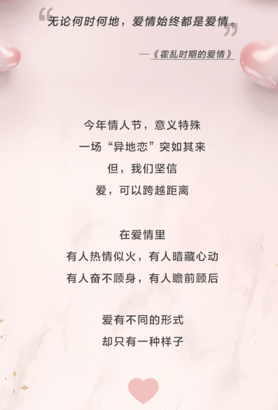疫情虽拉远了人与人之间的实际距离,但大家的心还是彼此相连的。在这个无法互相拥抱的情人节里,让我们通过“云表白”的方式,大声说出爱吧!