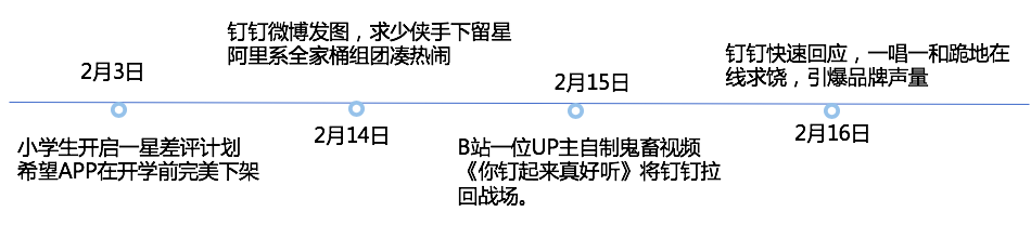 最有效果的营销不是主动做出来的,而是顺势借势而为,举重若轻达到营销目的。钉钉后续两波营销都是在浪来了之后,轻轻推波助澜:你一星差评,我就顺势装可怜,你以歌会友,我借势写歌回应,一唱一和,引发全民帮忙带节奏。