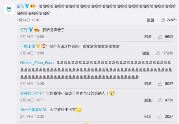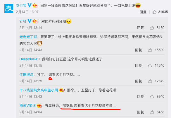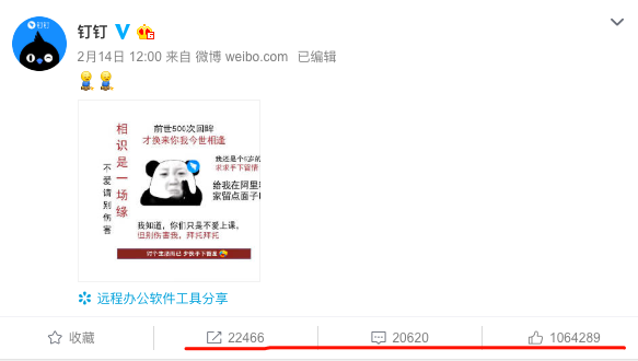 让子弹飞到什么时候?11天以后,2月14日情人节,钉钉做了第一次发声,并联合阿里全家桶组团上分,效果如何呢?看看这动不动上万的转评赞数量,对比前些天,简直天壤之别。