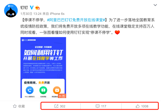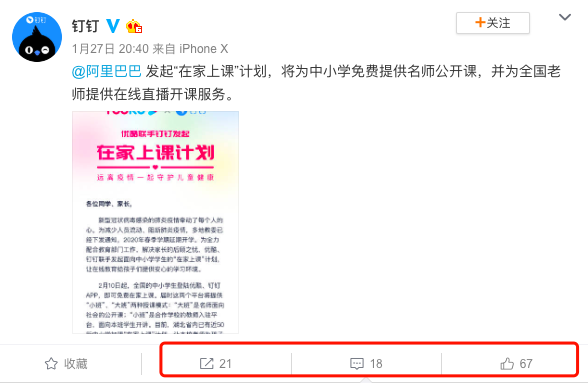 1月27日,钉钉发起“在家上课计划”,并义正言辞:我们全力配合教育部门工作!我们要解决家长的后顾之忧。