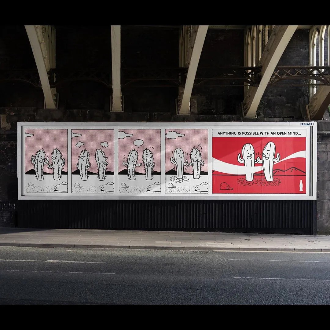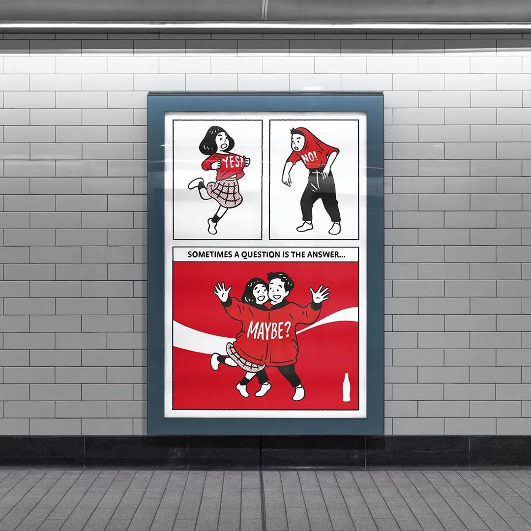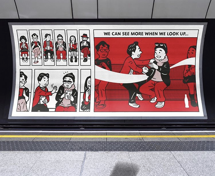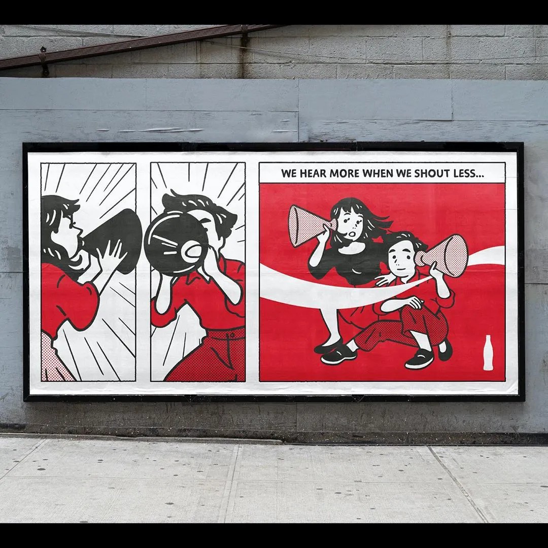 与此同时,日本插画家 Nimura Daisuke 以可口可乐的红、白、黑三色方案为特色,展示了“为 Empathy Gap(移情差距)建立沟通的桥梁”这一主旨。