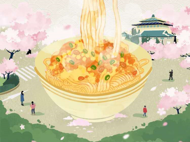而一键生成的结果页除了明显的用户所在城市、制作总数和战绩对比等文字数据以外,美味可口的热干面漫画占据了大幅画面,设计者还巧妙地加入了长江大桥、黄鹤楼、武汉大学、樱花树、户部巷等具有武汉明显城市特征的设定。