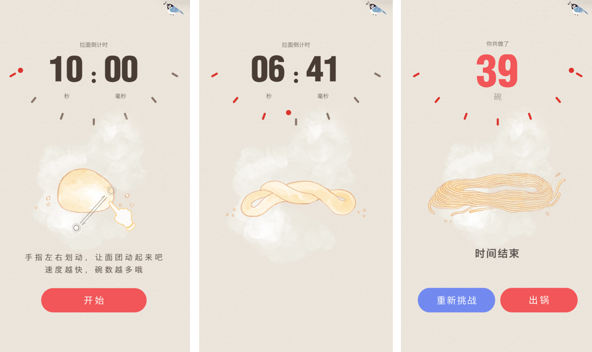 具体到「做一碗温暖的面」来说,它的互动机制并不复杂,对参与者的能力要求不高。在限定的10秒钟内,观看者通过快速滑动屏幕模拟做面,不需要开动脑瓜,降低了用户参与和思考的成本。