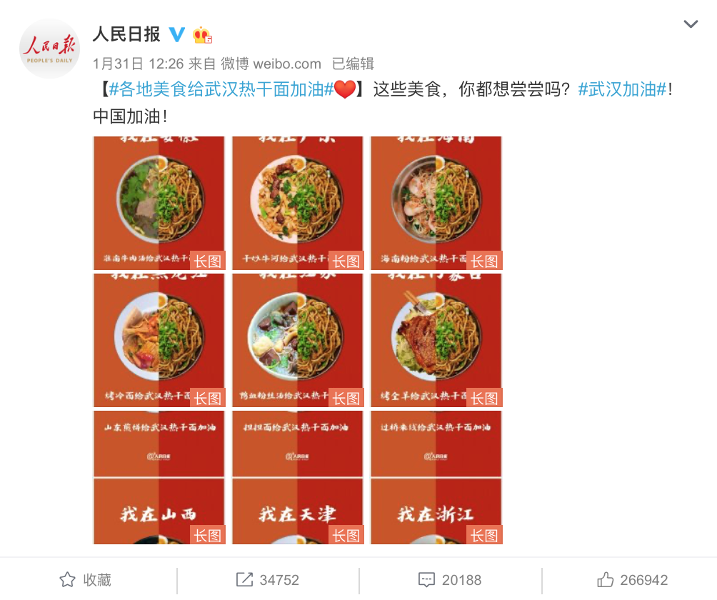 而热干面作为武汉的代表性食物——武汉人每天要吃掉600万碗热干面——此时成为了武汉的食物记忆,也成了全国人民牵挂与鼓励武汉同胞情感表达的最佳载体。
