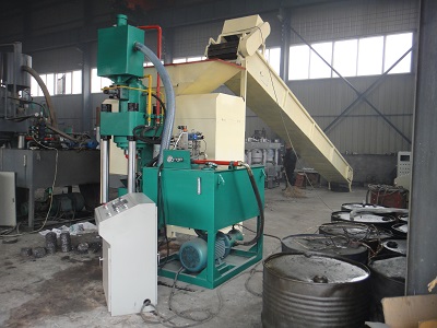 因钢屑大部分比较长,多不条状或是团状,造成无法下料,即使能下料也因比较蓬松,使其无法边续生产,故需加装钢屑粉碎设备,因钢屑材料本身流行性差,造成其送料机构的特殊性,大大区分于其他金属屑压块机的送料机构,送料机构为螺旋送料,钢屑里大部分还含有切削液,钢屑压块机还含有切削液收集装置,我公司研制的整条生产线轻松完也了上述问题,是切削压块机的首选产品。