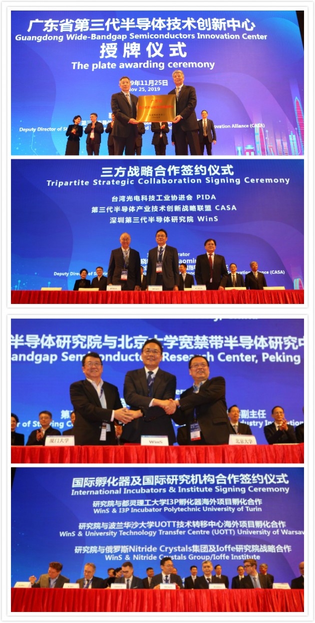 同时,经过精心筹备,达成了一批合作项目,会上进行了签约仪式。其中,深圳第三代半导体研究院与台湾光电科技工业协进会、第三代半导体产业技术创新战略联盟签约,三方将在产学研融合创新方面进行通力合作。深圳第三代半导体研究院与厦门大学、北京大学宽禁带半导体研究中心合作签约,三方在基础研究、人才培养、实验室共建等方面进行深入合作。深圳第三代半导体研究院与荷兰屯特大学、意大利都灵理工大学、波兰华沙大学签约三方将在人才培养、创新项目培育、孵化与转化等方面通力合作。